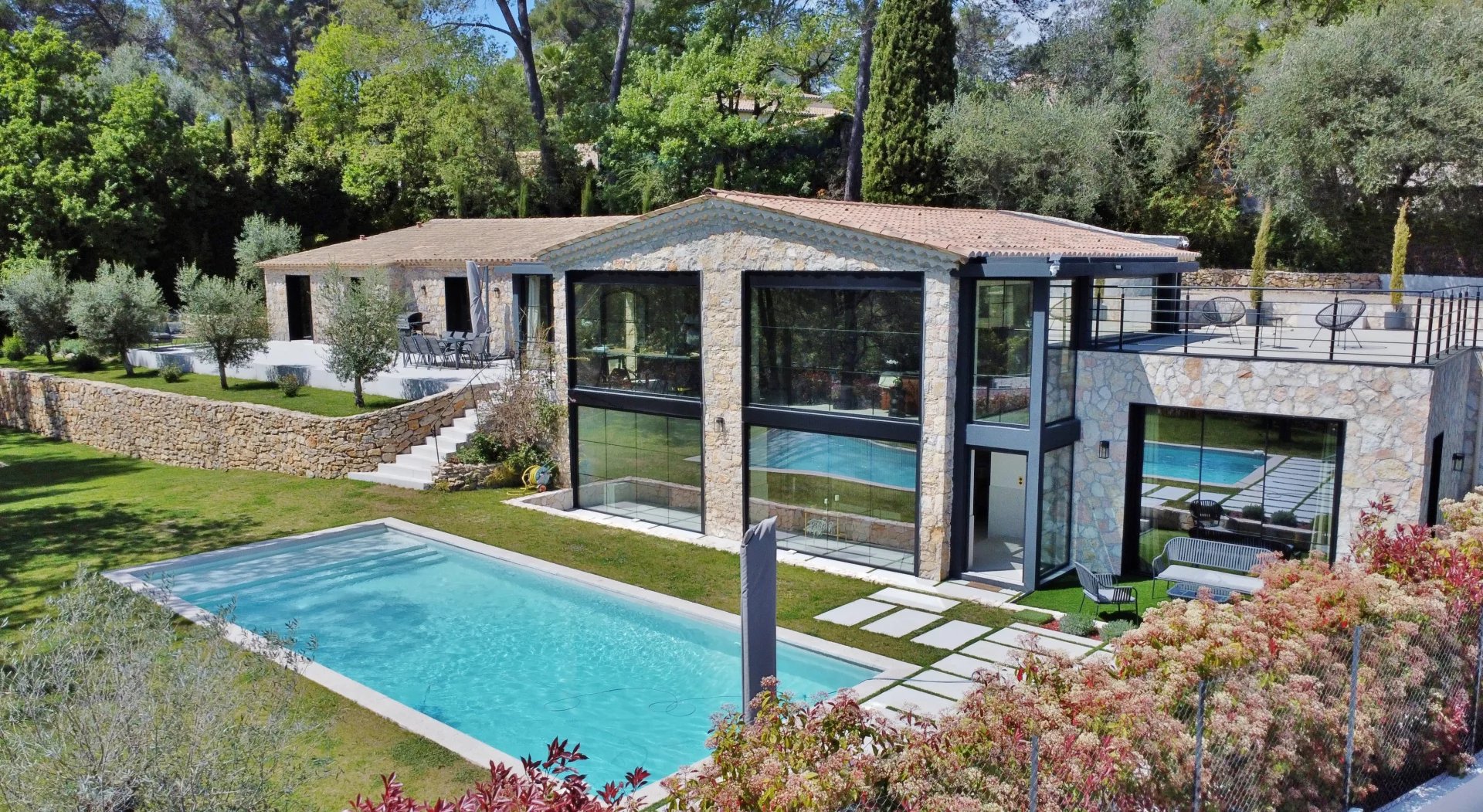 In Valbonne, within walking distance of the village, in a dominant south-facing and peaceful position, this magnificent fully renovated stone farmhouse with luxurious features offers: