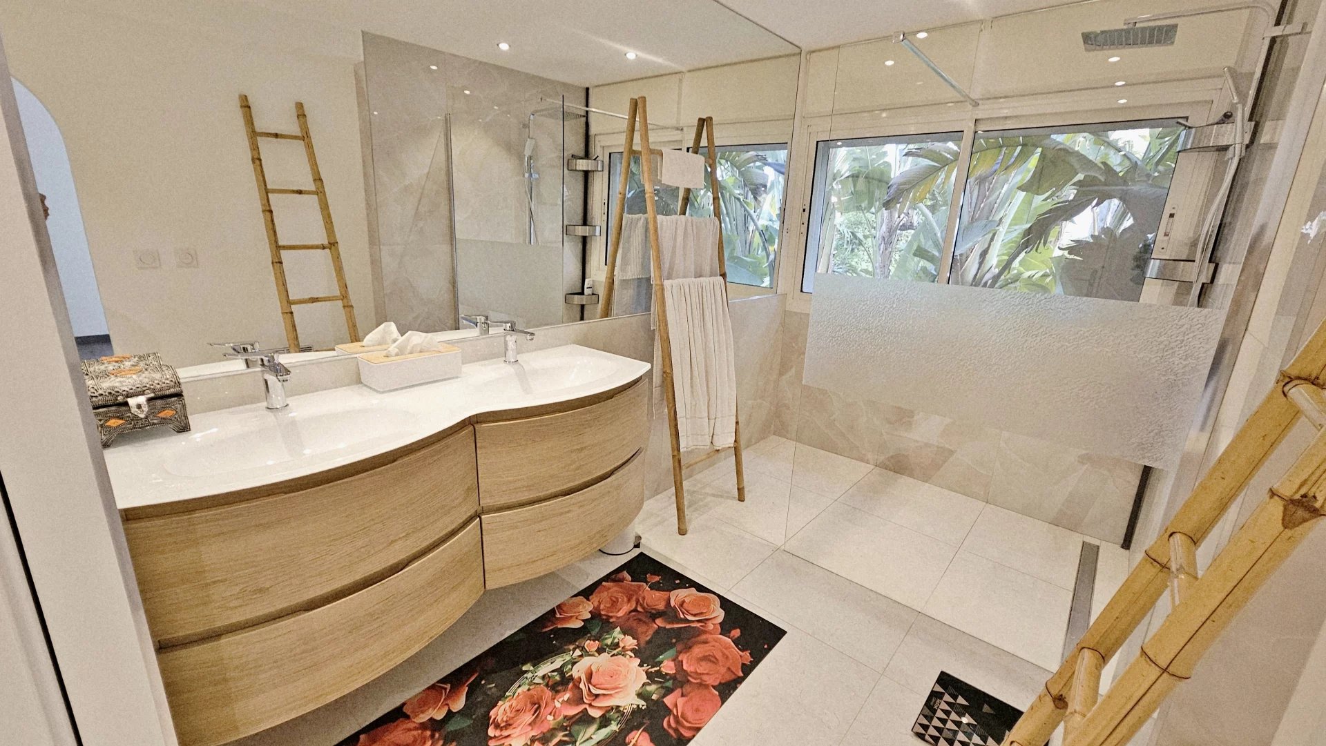 Le niveau principal propose un vaste séjour / salle à manger lumineux donnant sur la terrasse et la piscine, une cuisine indépendante, une suite parentale de plain-pied.