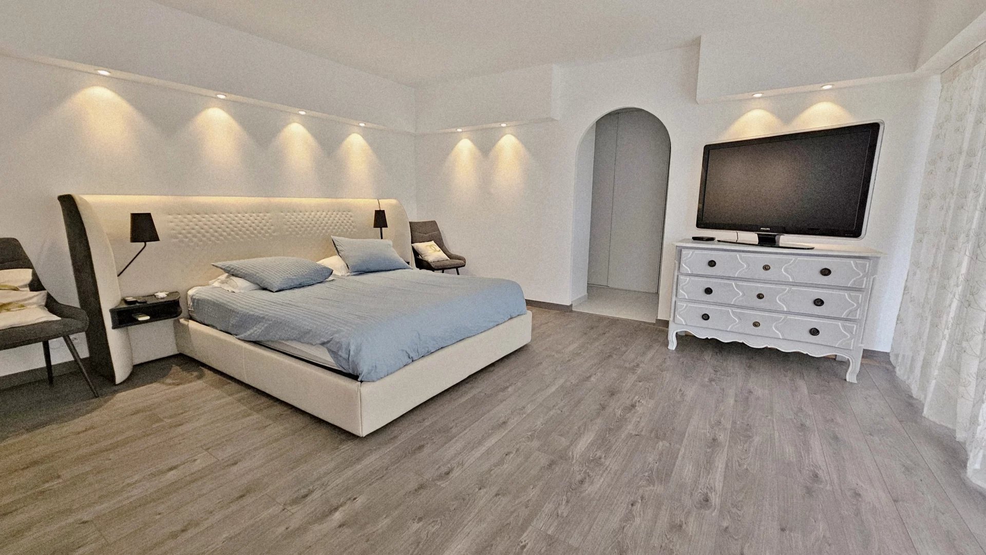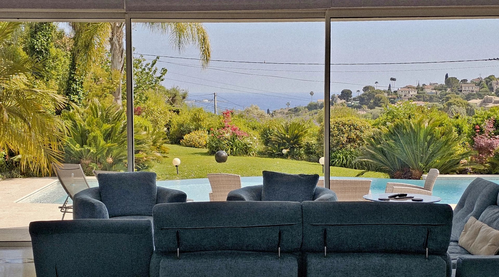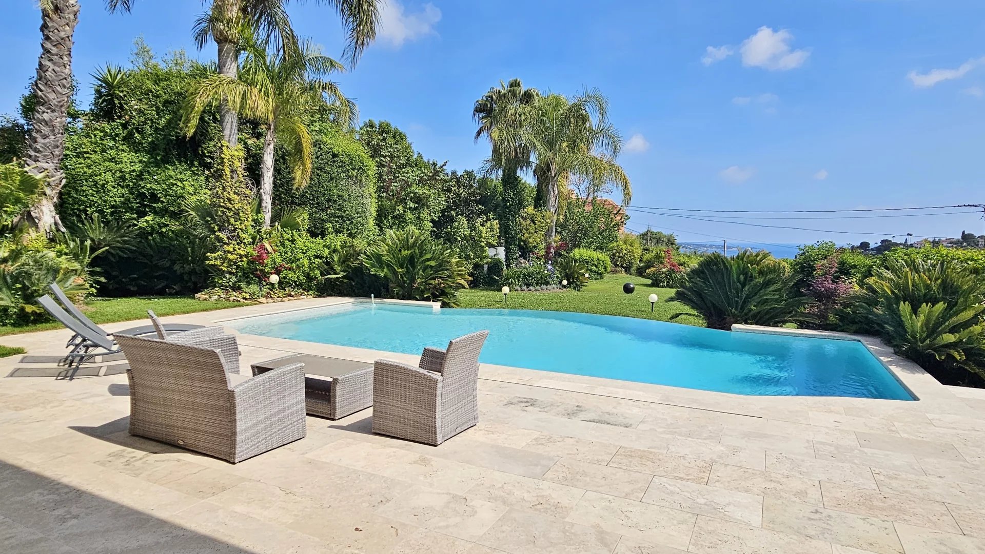 Dès l’entrée, une sublime perspective s’ouvre sur la piscine, le jardin et la mer en arrière-plan.