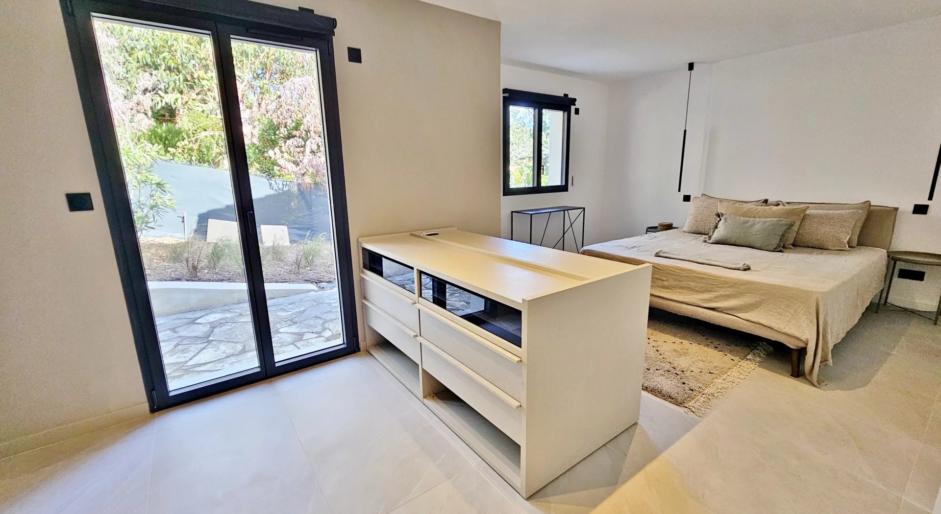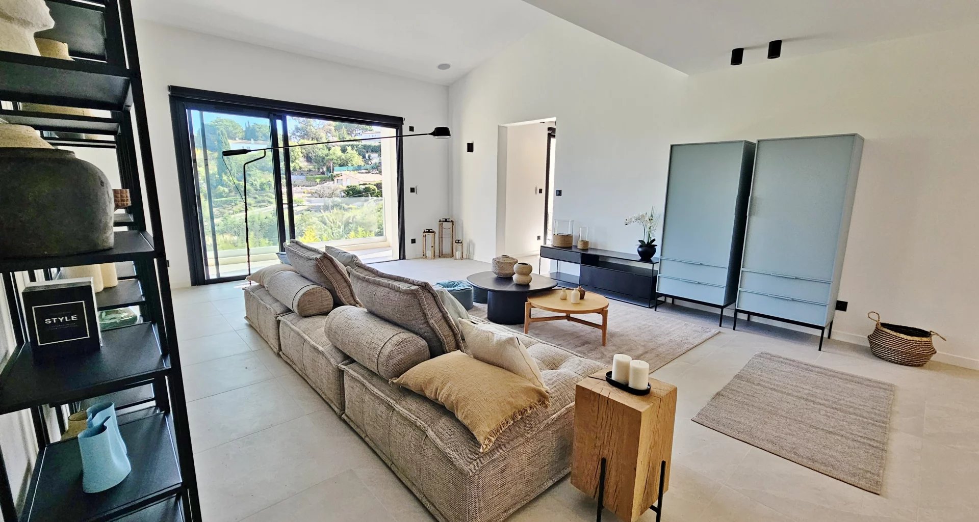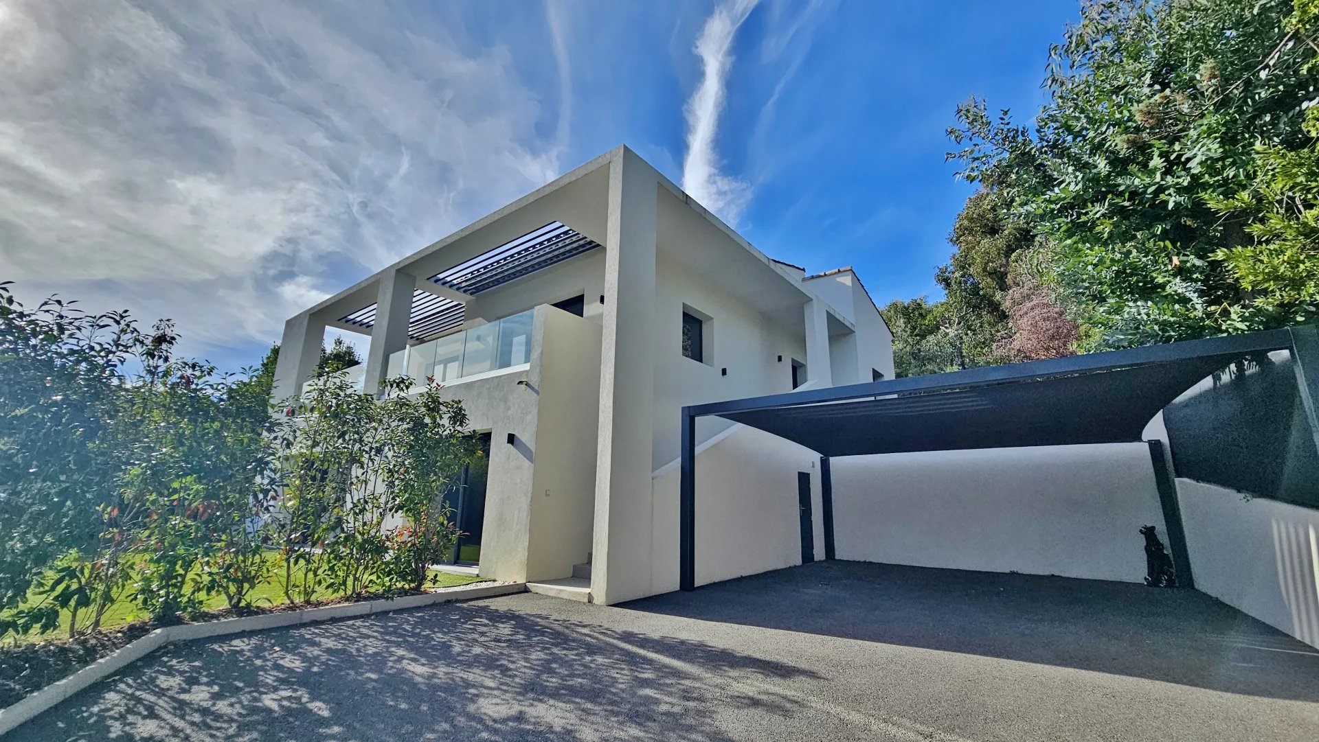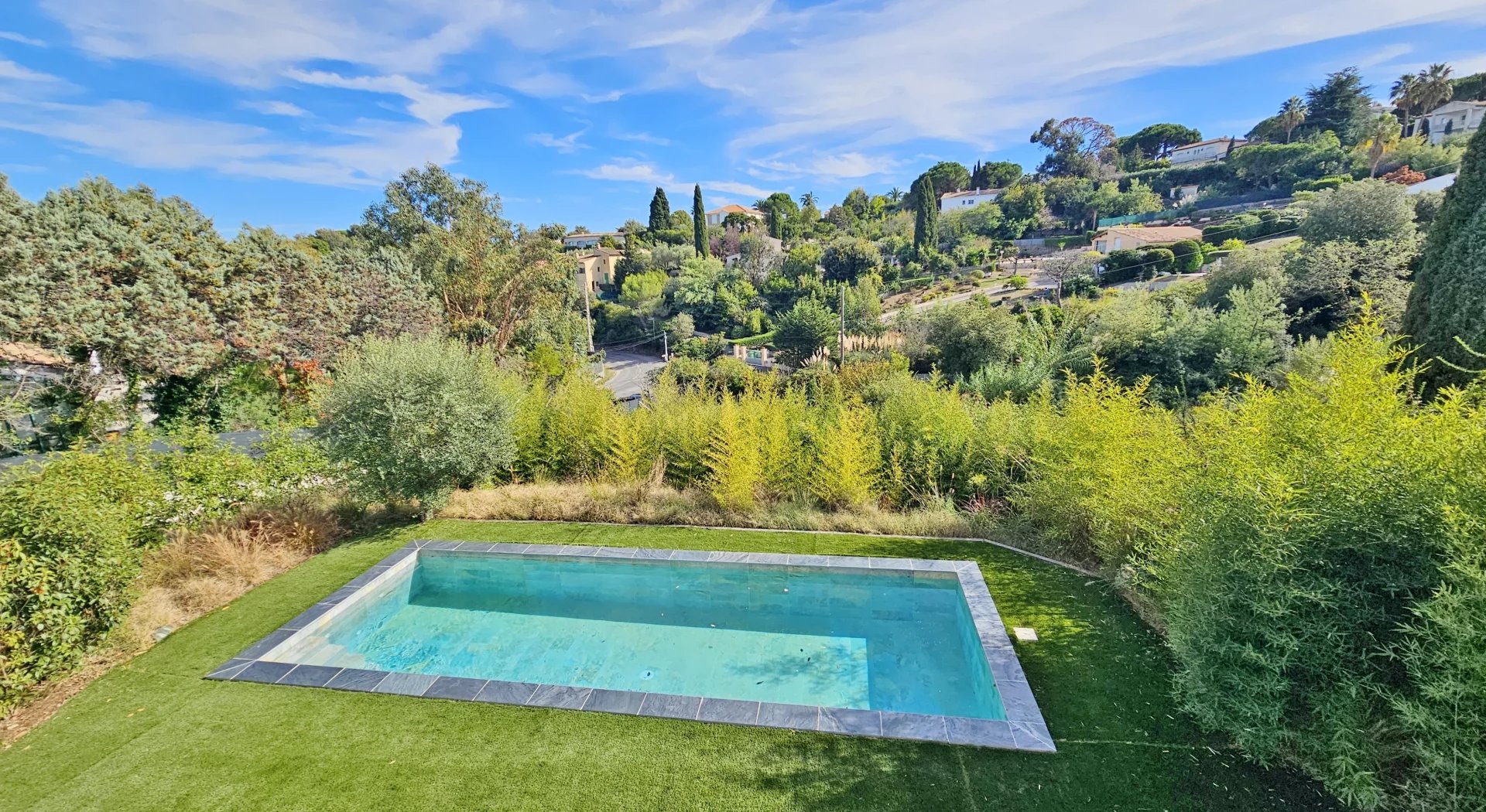 Cette magnifique villa entièrement rénovée de façon contemporaine est située proche de Cannes, en position dominante, au calme avec une jolie vue dégagée. Elle offre une superficie de 208 m², avec de vastes espaces de vie répartis sur six pièces, dont cinq sont de spacieuses chambres. La propriété dispose de conforts modernes.