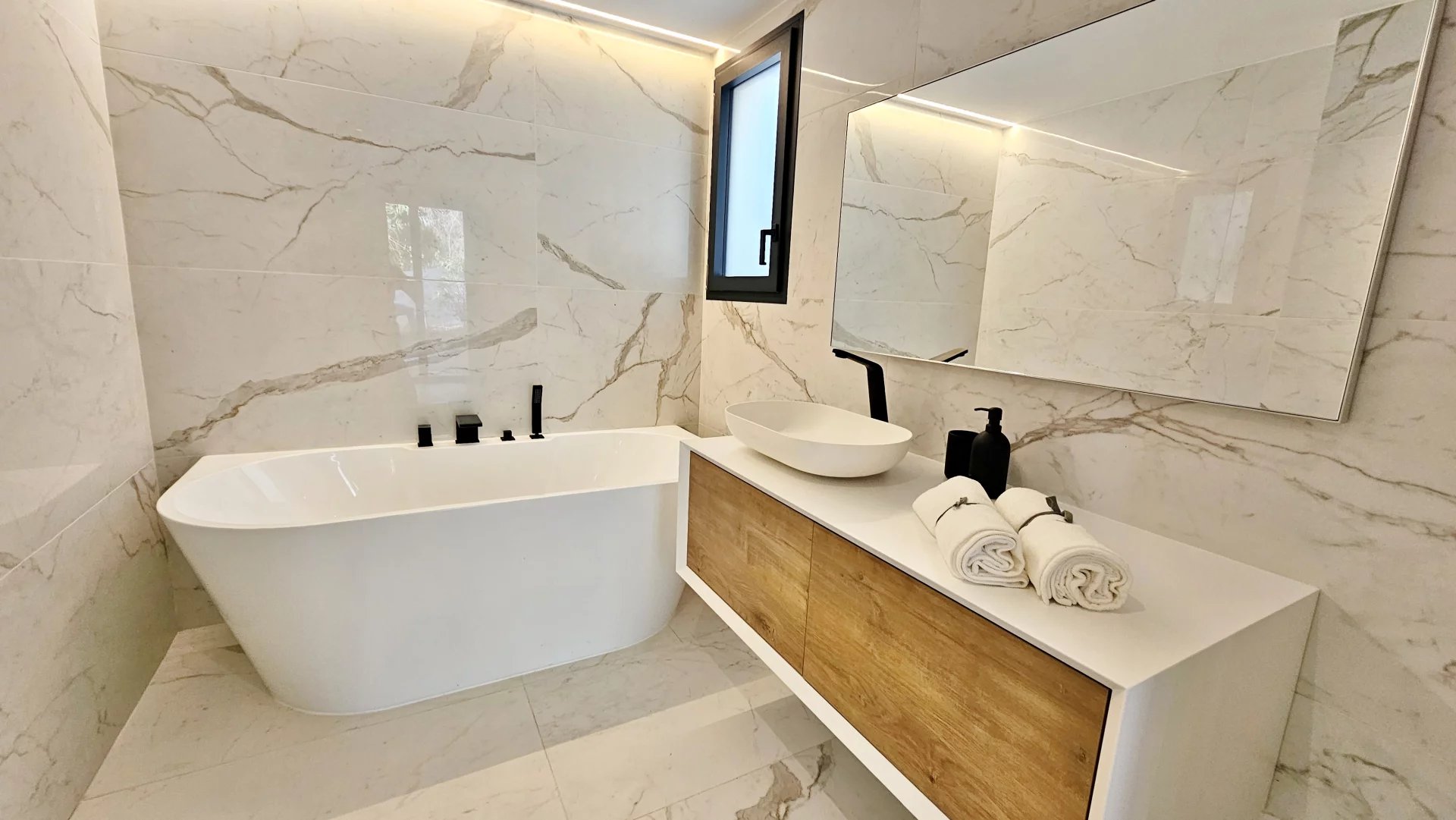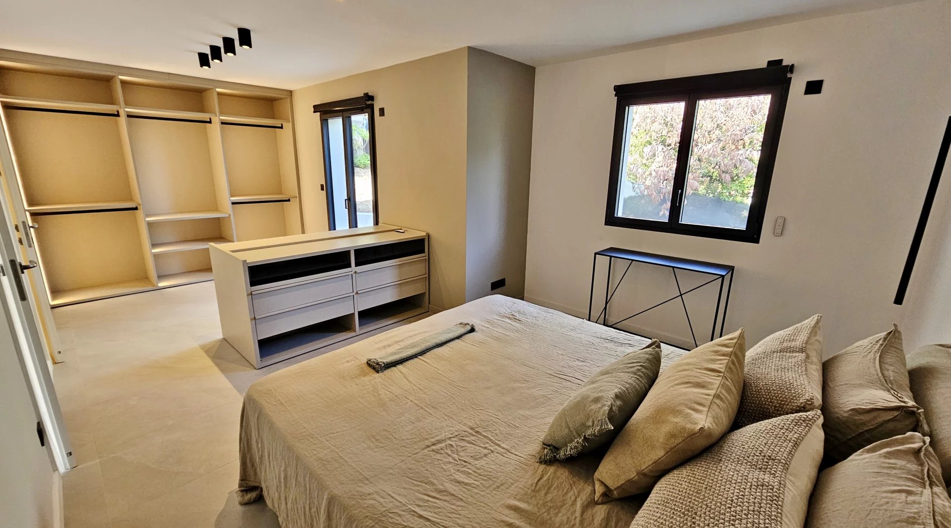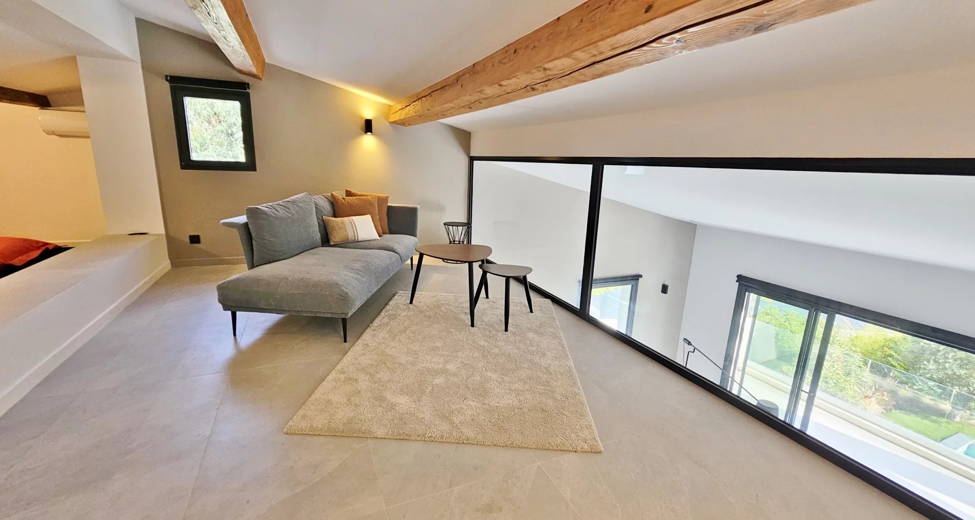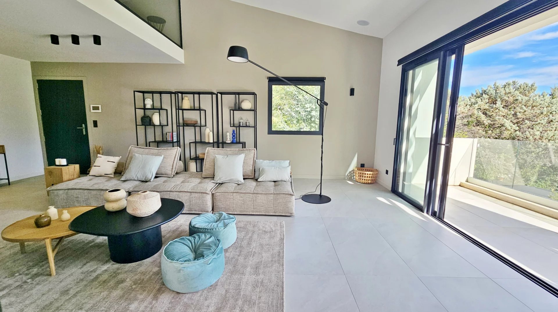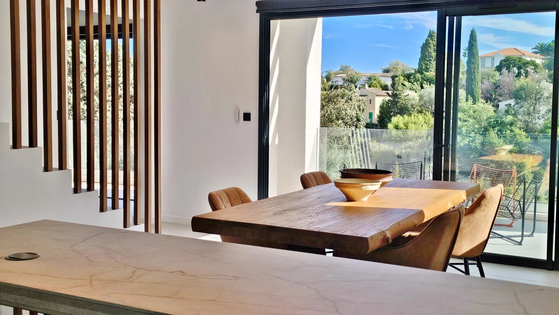 Cette magnifique villa entièrement rénovée de façon contemporaine est située proche de Cannes, en position dominante, au calme avec une jolie vue dégagée. Elle offre une superficie de 208 m², avec de vastes espaces de vie répartis sur six pièces, dont cinq sont de spacieuses chambres. La propriété dispose de conforts modernes.