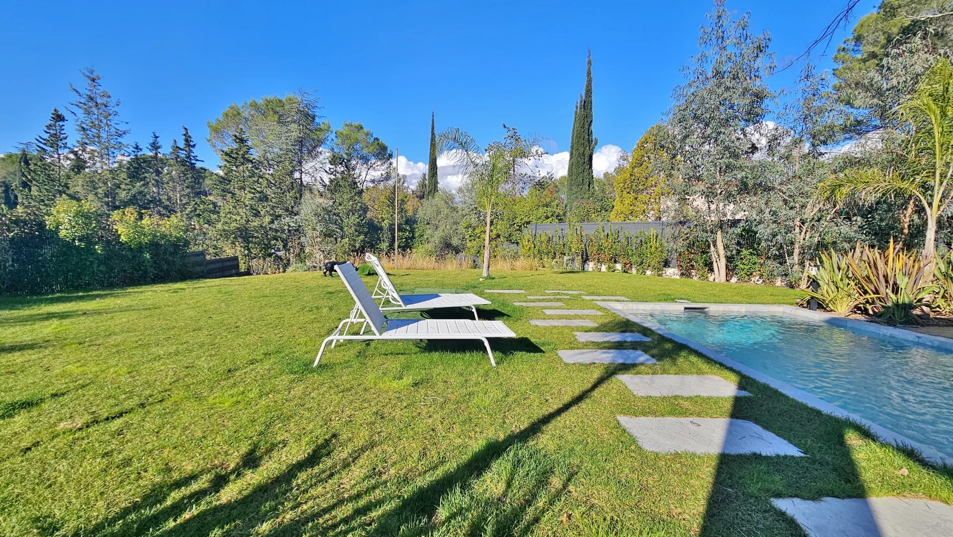 - Au rez-de-jardin : depuis une vaste entrée, on accède à la cuisine américaine ouverte sur la salle à manger et le séjour menant à une spacieuse terrasse couverte et au jardin complanté d'essences méditerranéennes,