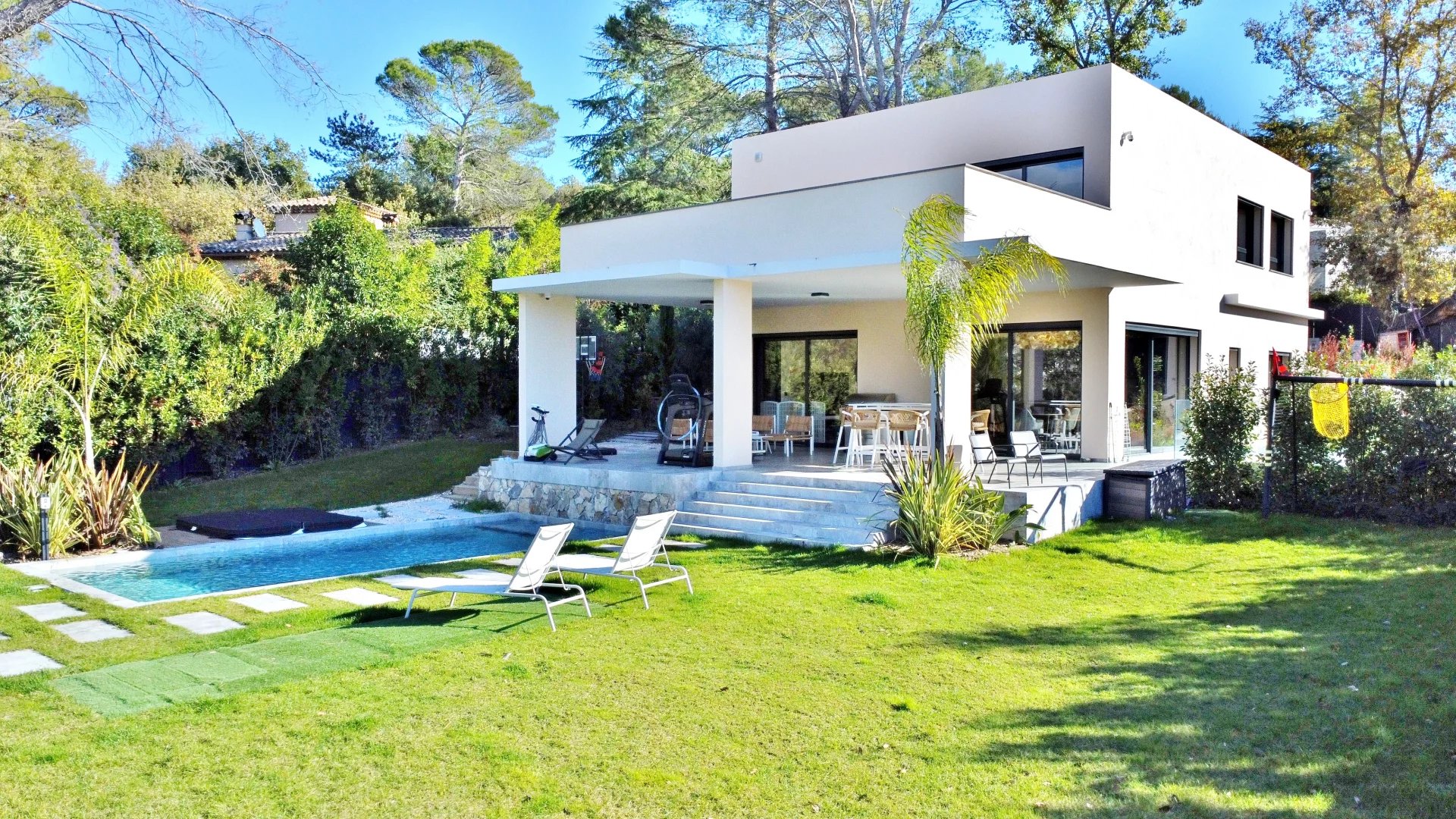 A Valbonne, en position dominante, à pied du village, 5 minutes de Mougins School et du CIV, magnifique villa contemporaine construite en 2025, d'une superficie de 210m² comprenant :